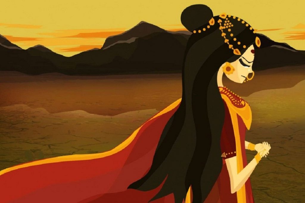 A depiction of Amba, a lone princess abandoned by her lover, her abductor, her father and the king. She is fully dressed in bridal costume, yet it is shown she is in the middle of a desert, completely hopeless and searching for truth.