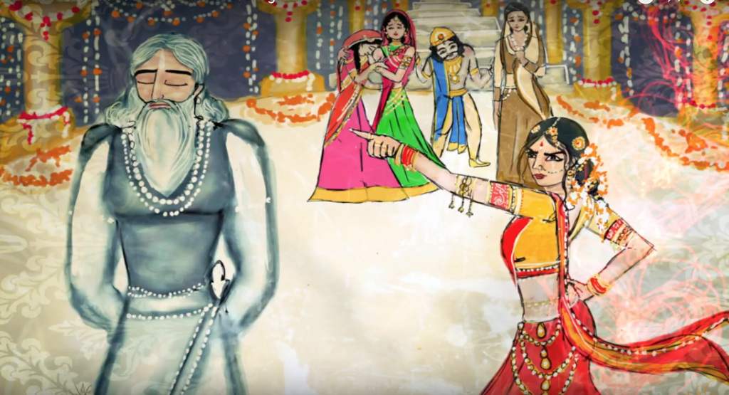 Amba accusing Bheesma for her predicament, while her sisters weep at a distance accompanied by Queen Satyavati and the weakling king Vichitravirya, mere spectators to this unfortunate incident.