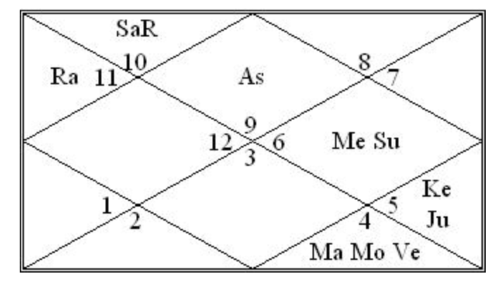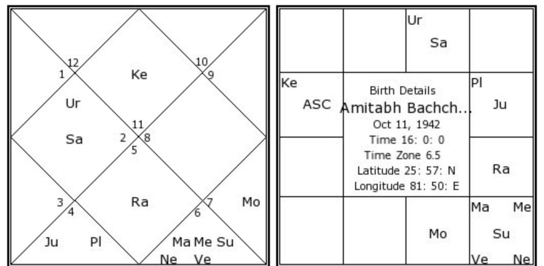 The above chart is the birth chart of famous actor Amitabh Bachhan. Look at the chart on the left hand side. Here, the Planet Mercury is denoted with the symbol “Me” and it is placed in the house which has the number 6. Number 6 denotes that it is the house of Virgo (Aries = 1, Taurus =2, Gemini = 3, Cancer = 4, Leo = 5, Virgo = 6).