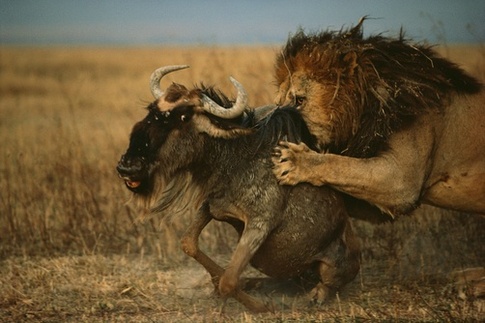 The Lion waits, gathers information, collects other fellow lions and tries to hunt a small wildebeest. With repeated failures, hustling and determination, he succeeds in cracking down a bigger one.